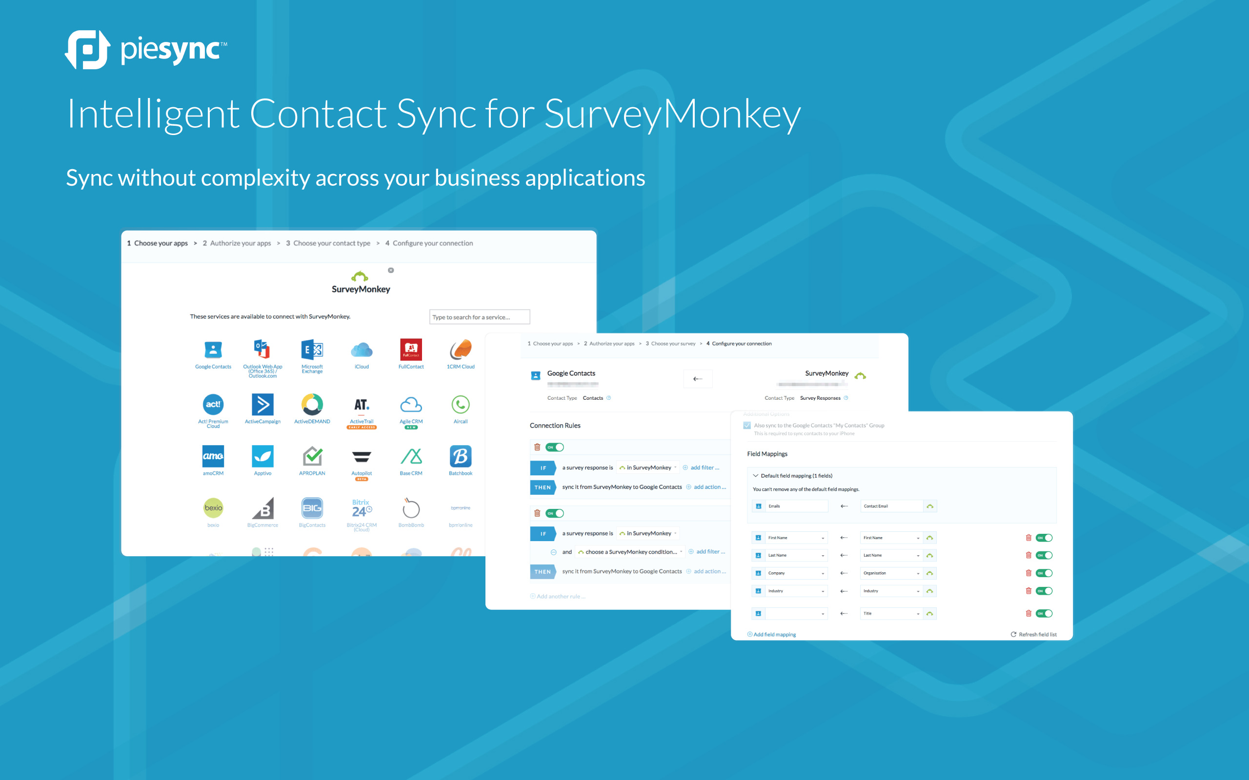 PieSync integrates SurveyMonkey with 140+ applications for an automatic contact sync. Every time you collect a survey response, it is automatically synced with the other app eliminating import/export!
