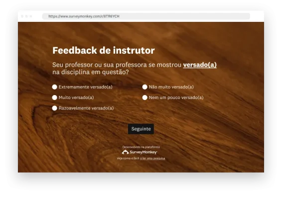 Exemplo: a professora Cláudia quer montar uma pesquisa para coletar feedback dos alunos no final do semestre. Ela usa uma conta gratuita da SurveyMonkey para escolher um tema de alto contraste, muda para uma fonte Sans-Serif convidativa, adiciona o logotipo da escola ao cabeçalho e envia um pulso semanal para a turma, sem necessidade de conhecimento em design. Comece gratuitamente você também!