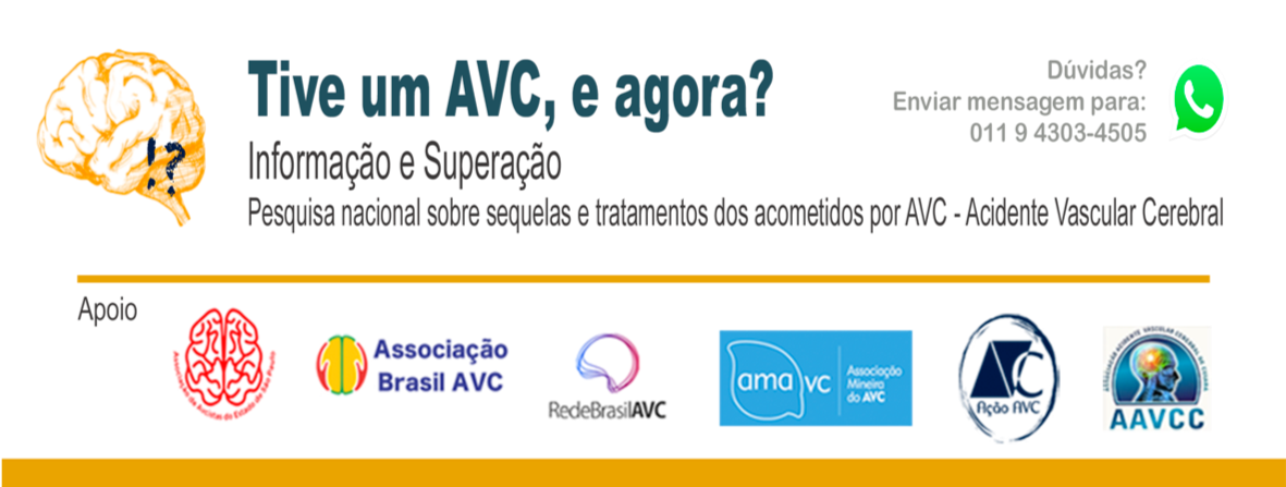 Você, acometido por AVC, quer melhorar sua qualidade de vida? A Dra. Alexandra P. Gaspar, médica fisiatra e Adriana Fóz, educadora, especialista em Neuropsicologia e AVCista, convidam você a fazer parte desta pesquisa nacional sobre sequelas e tratamentos após o AVC. Esta pesquisa tem o apoio de algumas das mais importantes associações relativas ao AVC, visa desenvolver conteúdo e técnicas para facilitar o seu dia a dia, de sua família e dos profissionais envolvidos. Você vai demorar 15 minutos e ajudar milhares de pessoas. Participe!